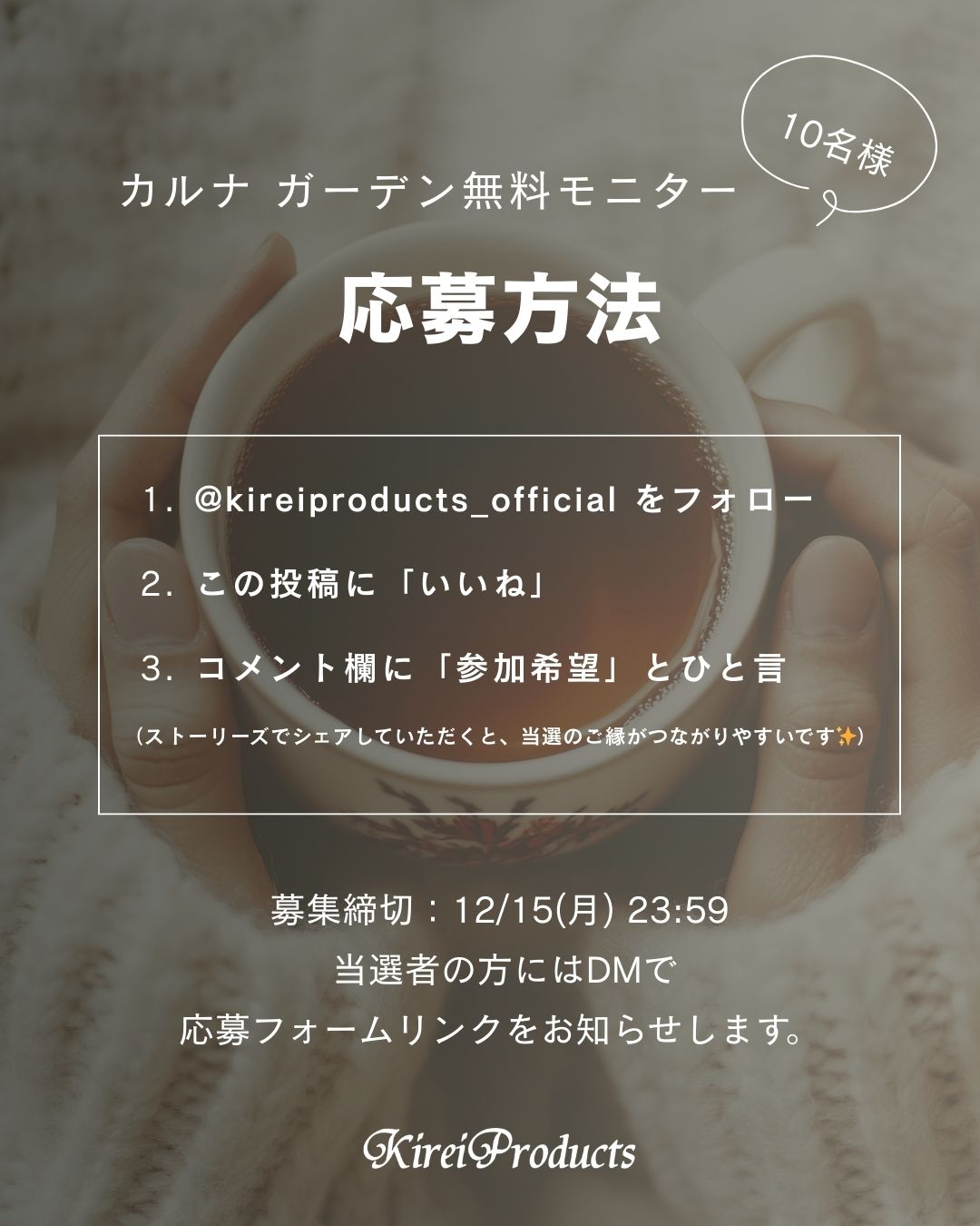 Instagramにて募集を行っております。詳細は、KireiProducts公式Instagramの 該当投稿をご覧ください。